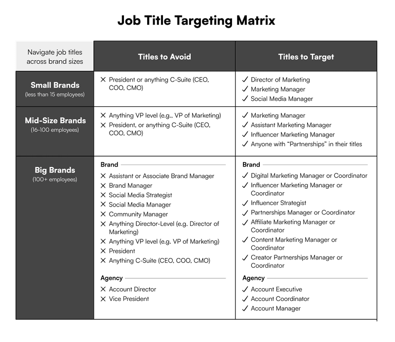 I've found it most effective to target the "Manager" level at mid-size brands as they usually have decision-making power but aren't too senior to be entirely removed from the partnership process.