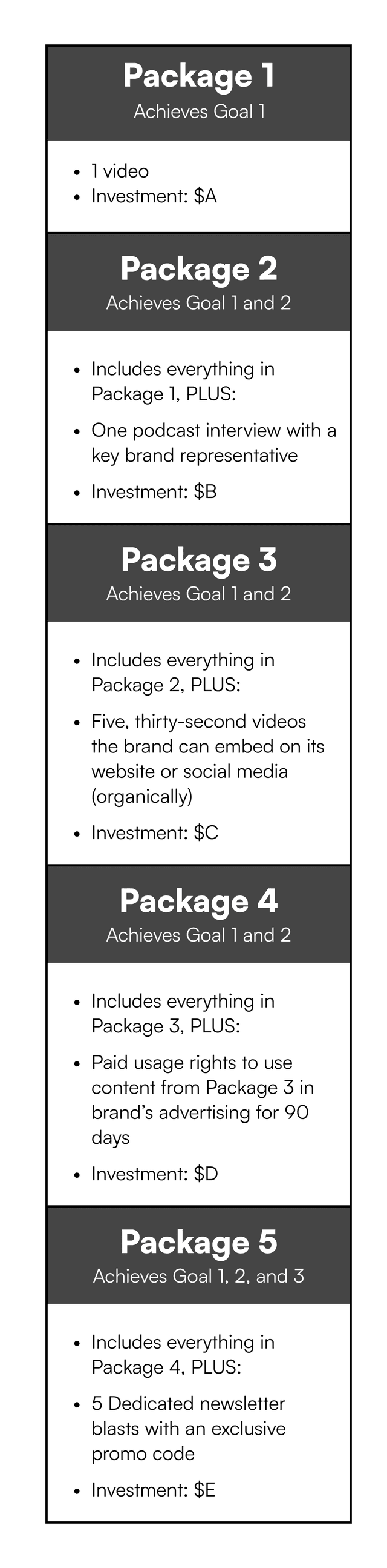 However, you can take a different approach when designing your proposal that will help brands understand why hiring you for the most expensive package is in their best interest.